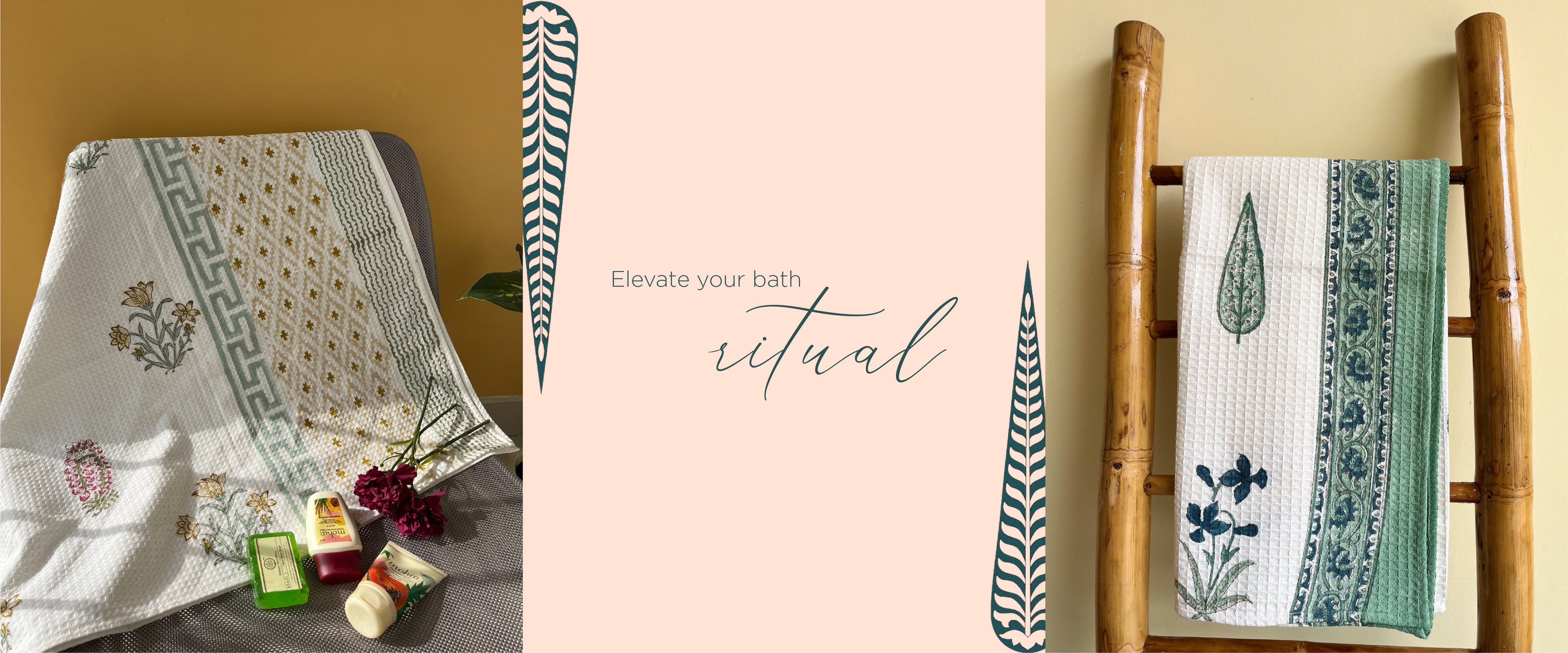 Spring Reverie Handblock Cotton Waffle Bath Towe Set ( 1 Bath Towel + 2 Hand Towel)