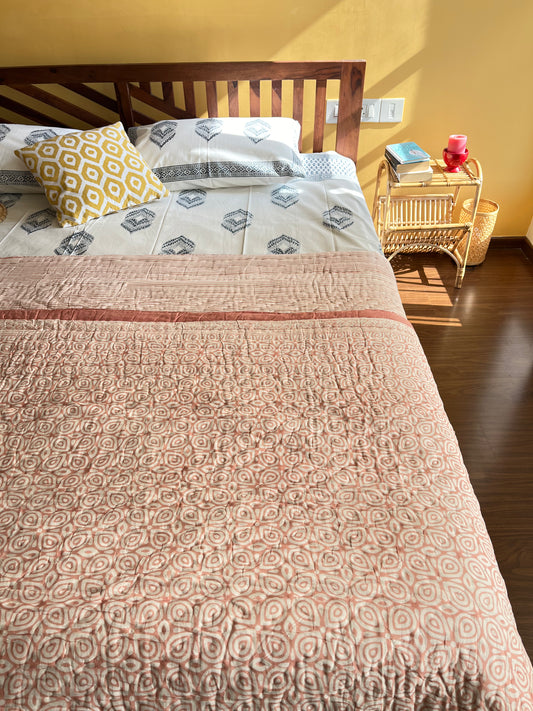 Peach Paisely Handblock Jaipuri Double Bed Quilt (90”*108”)