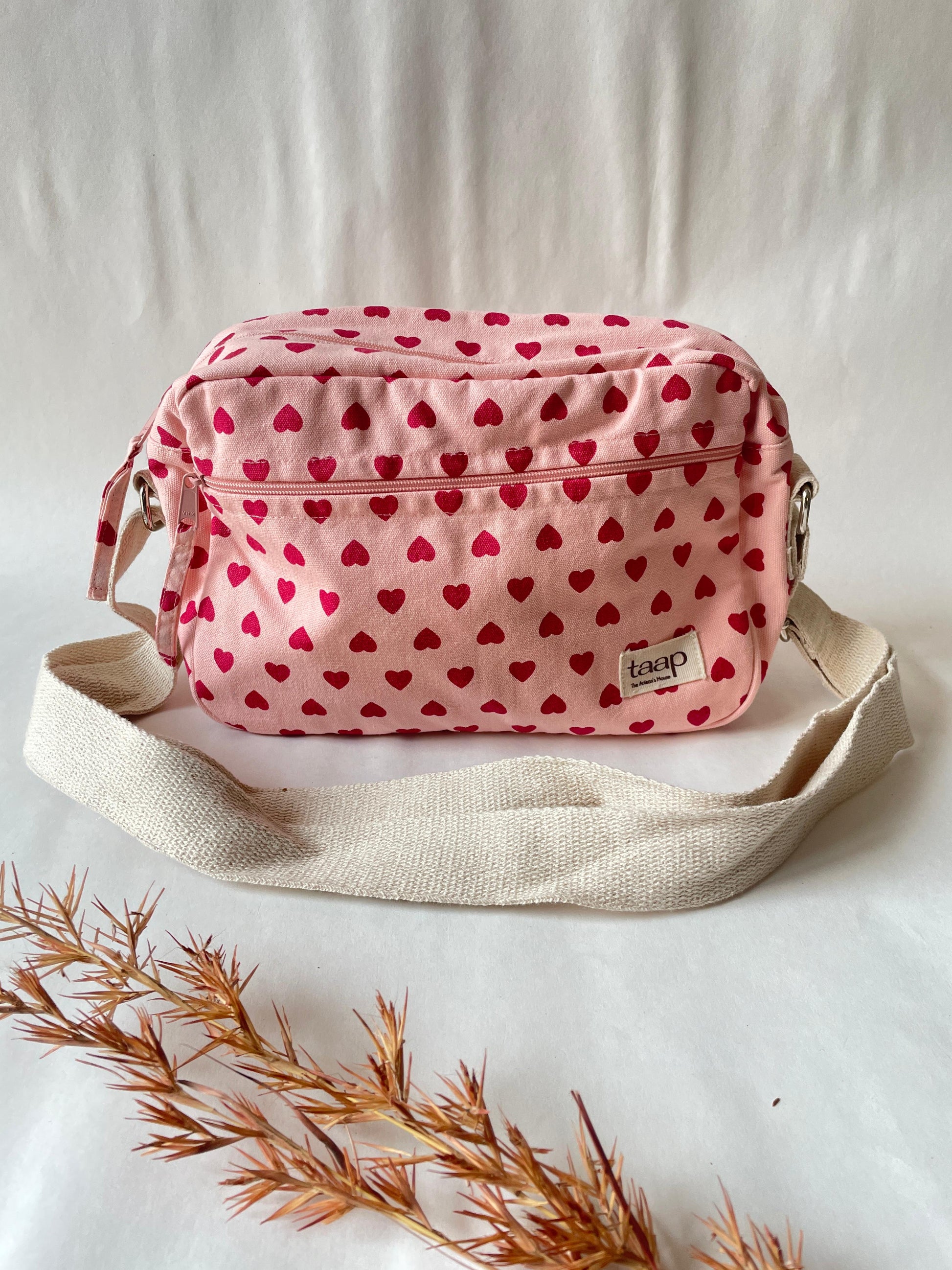 Pink Heart Cotton Canvas Horizontal Sling with Front & Inside Pocket – Sleek, Secure & Always Ready