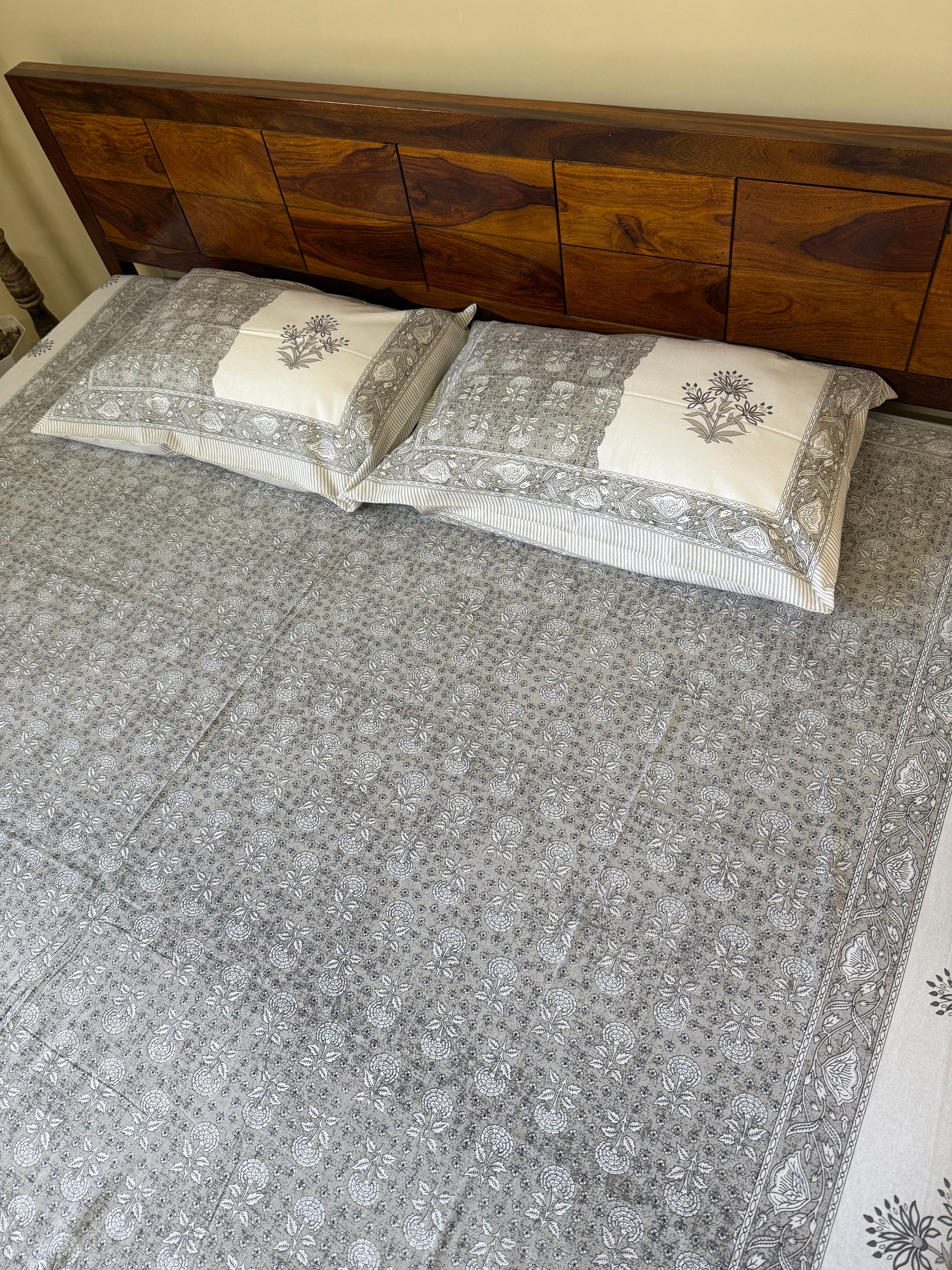Dewdrop Gey Cotton Queen Size Bedsheet with 2 Pillow Covers (90”*108”)