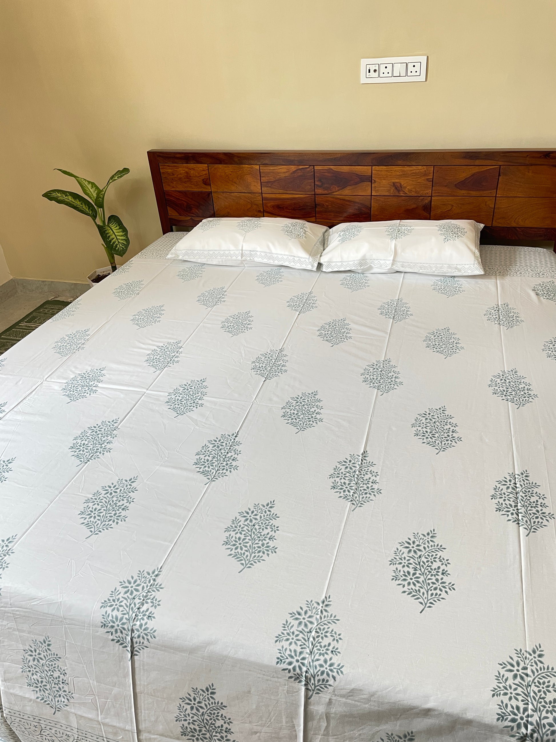 Grey Floral HandBlock King Size Bedsheet with 2 Pillow Covers (108”*108”)