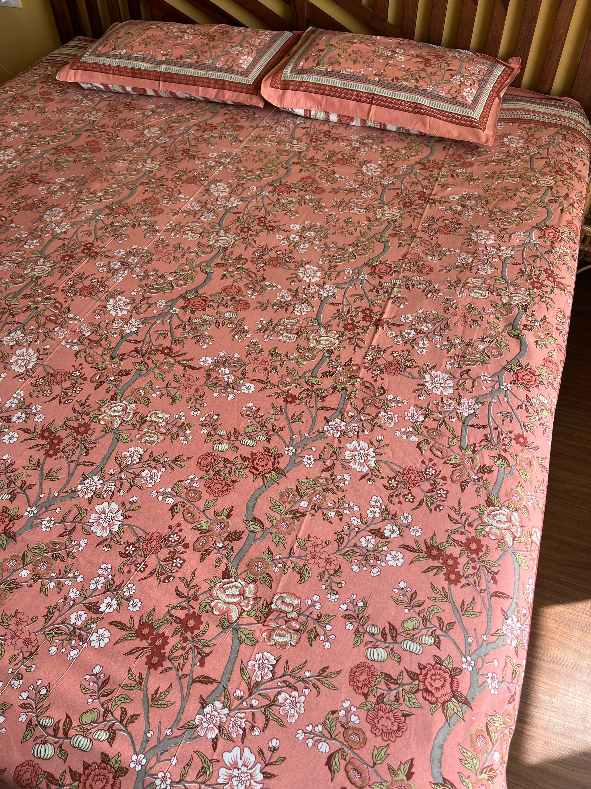 Peachy Bloom Cotton Queen Size Bedsheet with 2 Pillow Covers (100”*108”)